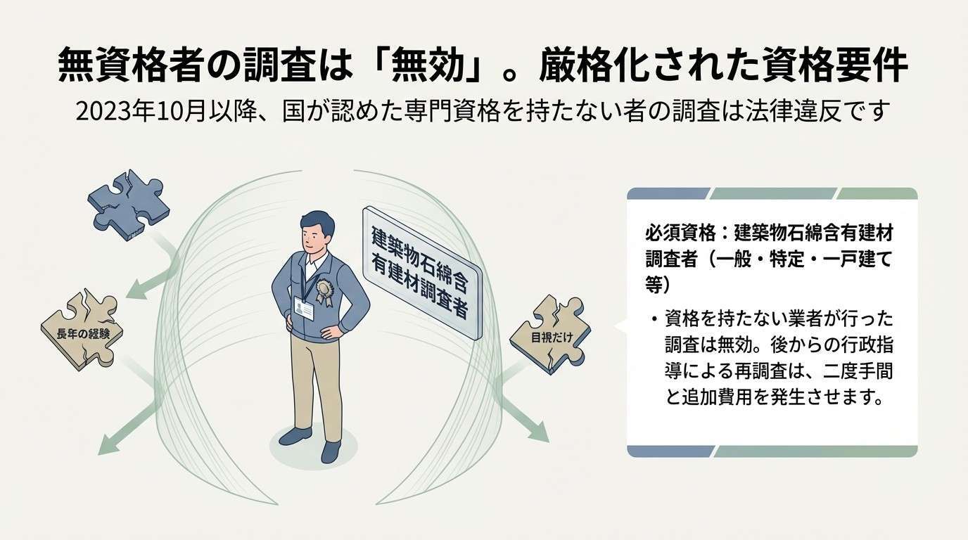 この資格を持たない者が行った調査は法律上無効となります。御社が依頼しようとしている解体業者やリフォーム業者に、この有資格者が確実に在籍しているかを必ず確認してください。