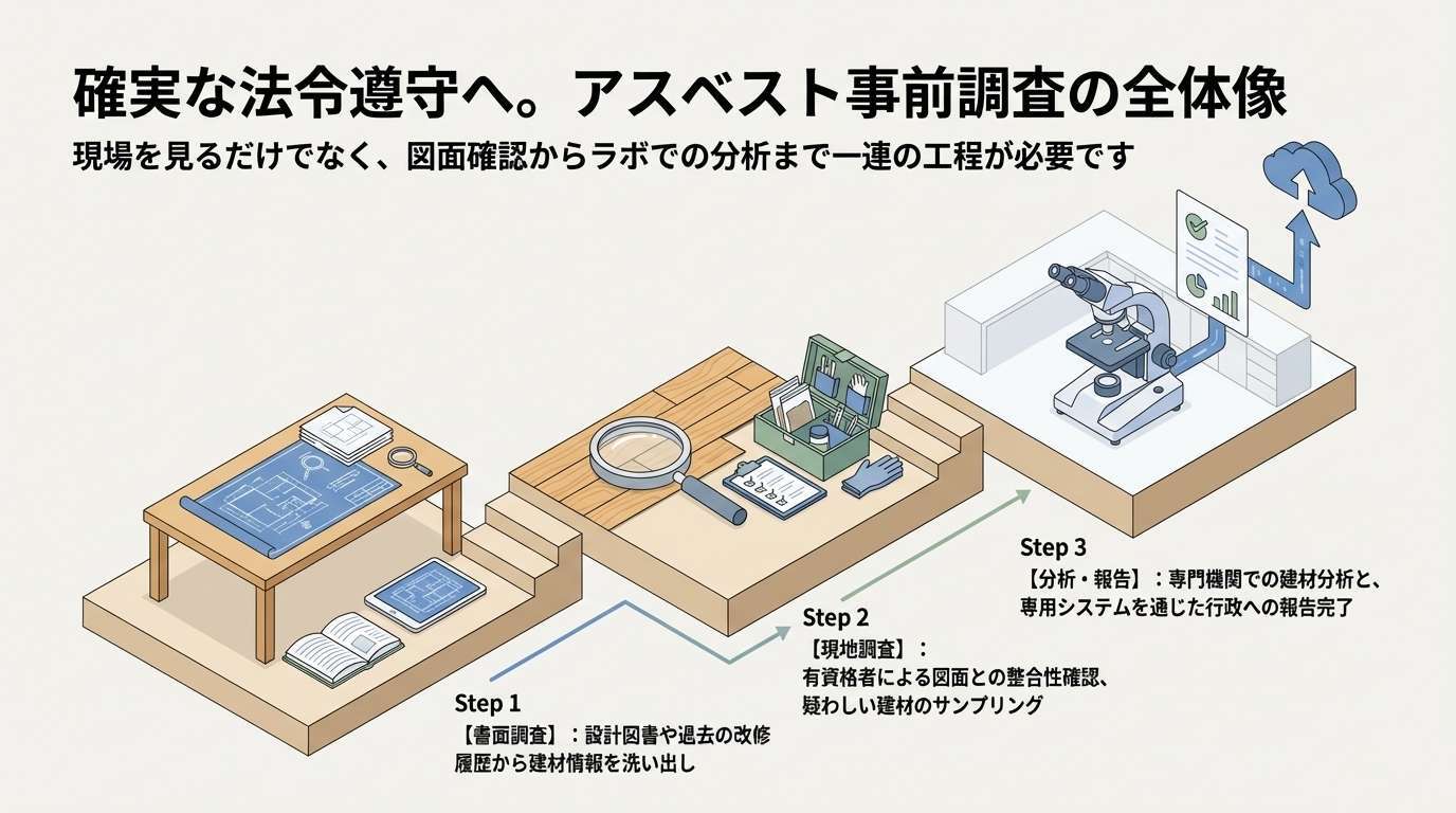 有資格者によるアスベスト事前調査は、大きく分けて以下の3つのステップで進行します。