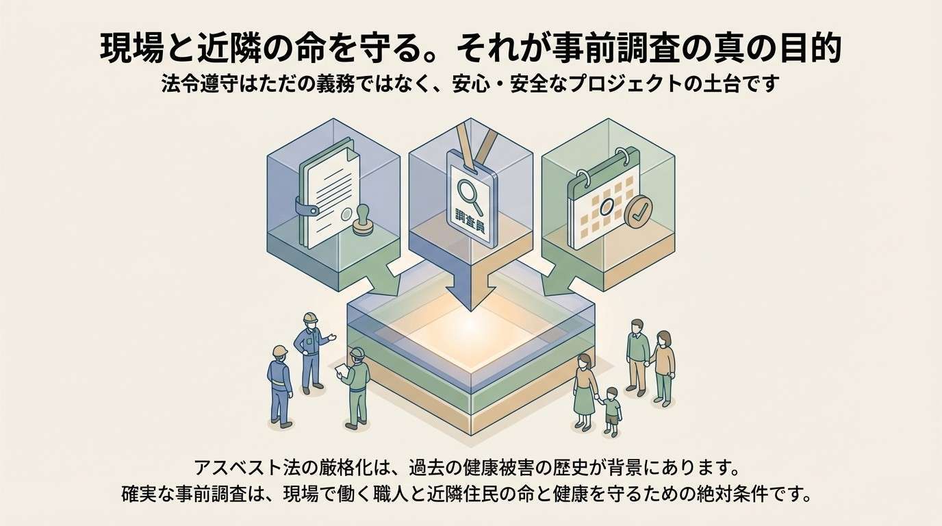 アスベスト関連の法律がここまで厳格化された背景には、過去に健康被害に苦しんだ多くの方々の歴史があります。事前調査は「ただの法律上の義務」ではなく、現場で働く職人や、近隣住民の方々の命と健康を守るための絶対条件です。