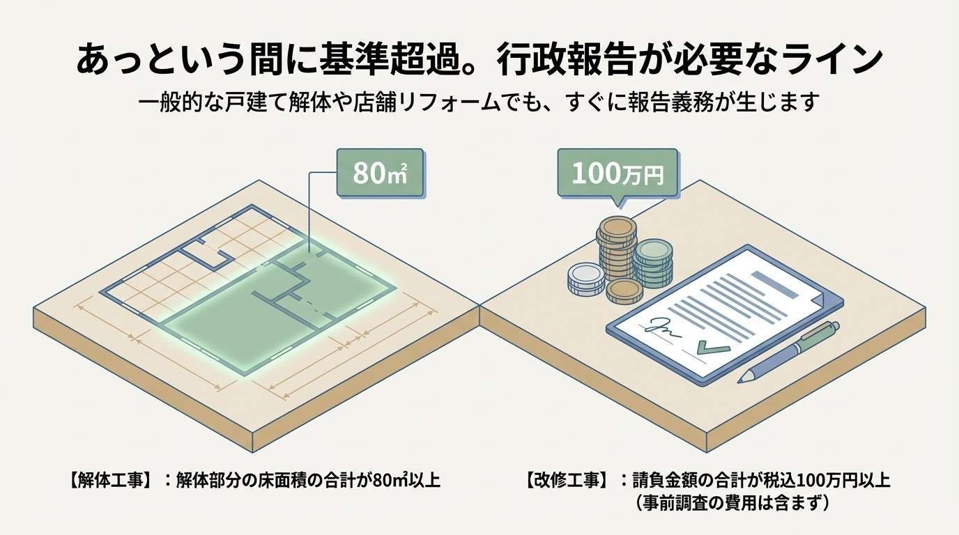 つまり、一般的な戸建て住宅の解体や、店舗のちょっとした内装リフォーム、外壁塗装であっても、あっという間に基準を超えて報告義務の対象となります。