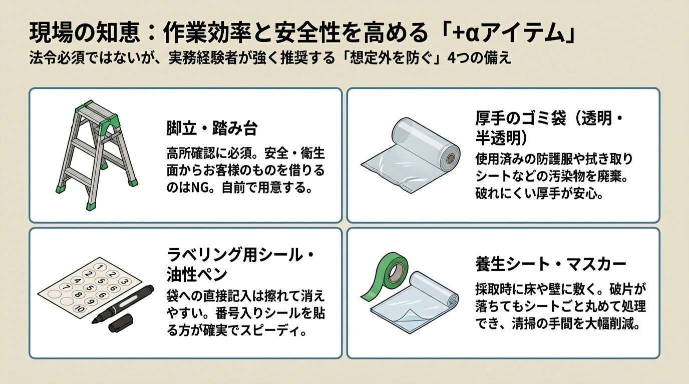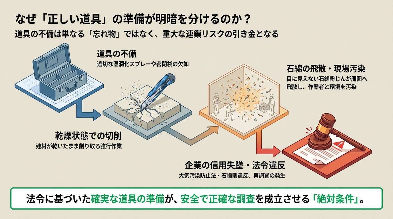 アスベストの事前調査において、道具の不備は単なる「忘れ物」では済みません。