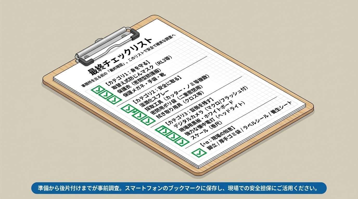 ぜひこの記事をスマートフォンのブックマークに保存し、現場へ向かう前の「最終チェックリスト」としてご活用ください。あなたの安全で確実な調査を応援しています!