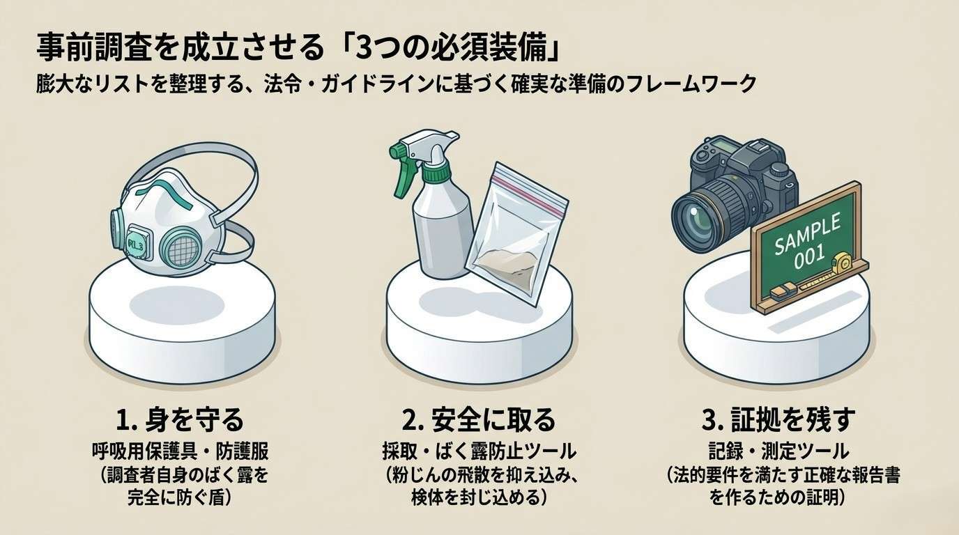 ここでは、環境省や厚生労働省のマニュアルに基づき、調査を成立させるために「絶対に欠かせない基本ツール」を3つのカテゴリーに分けて解説します。